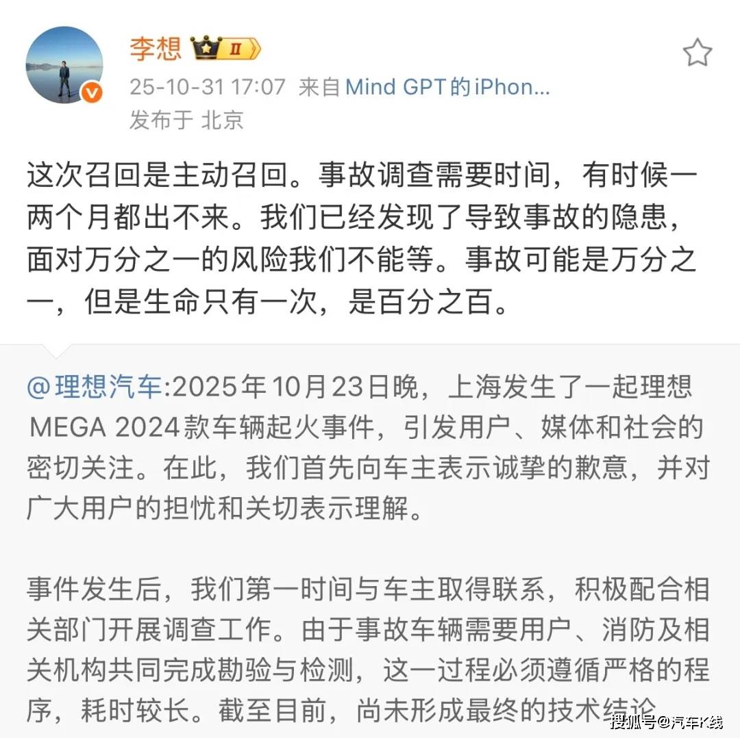 反观理想汽车,在相关部门发布事故调查结果前,主动对1.14万辆理想MEGA发起召回。