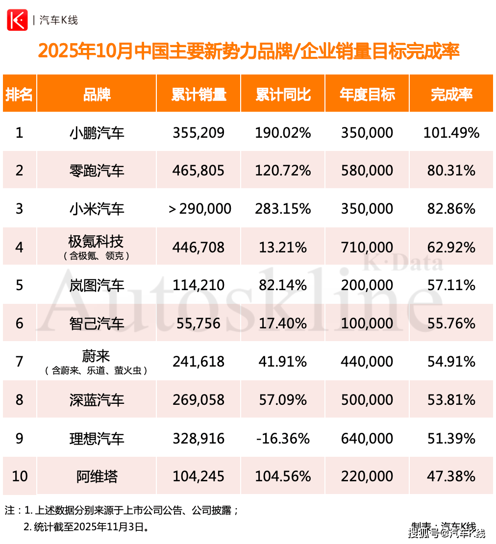 1-10月,其累计交付量已达35.52万辆,不仅以190.02%的同比增幅领跑新势力(小米汽车去年同期仅交付7个月,暂不作比较),更是率先达成35万辆的年度目标。